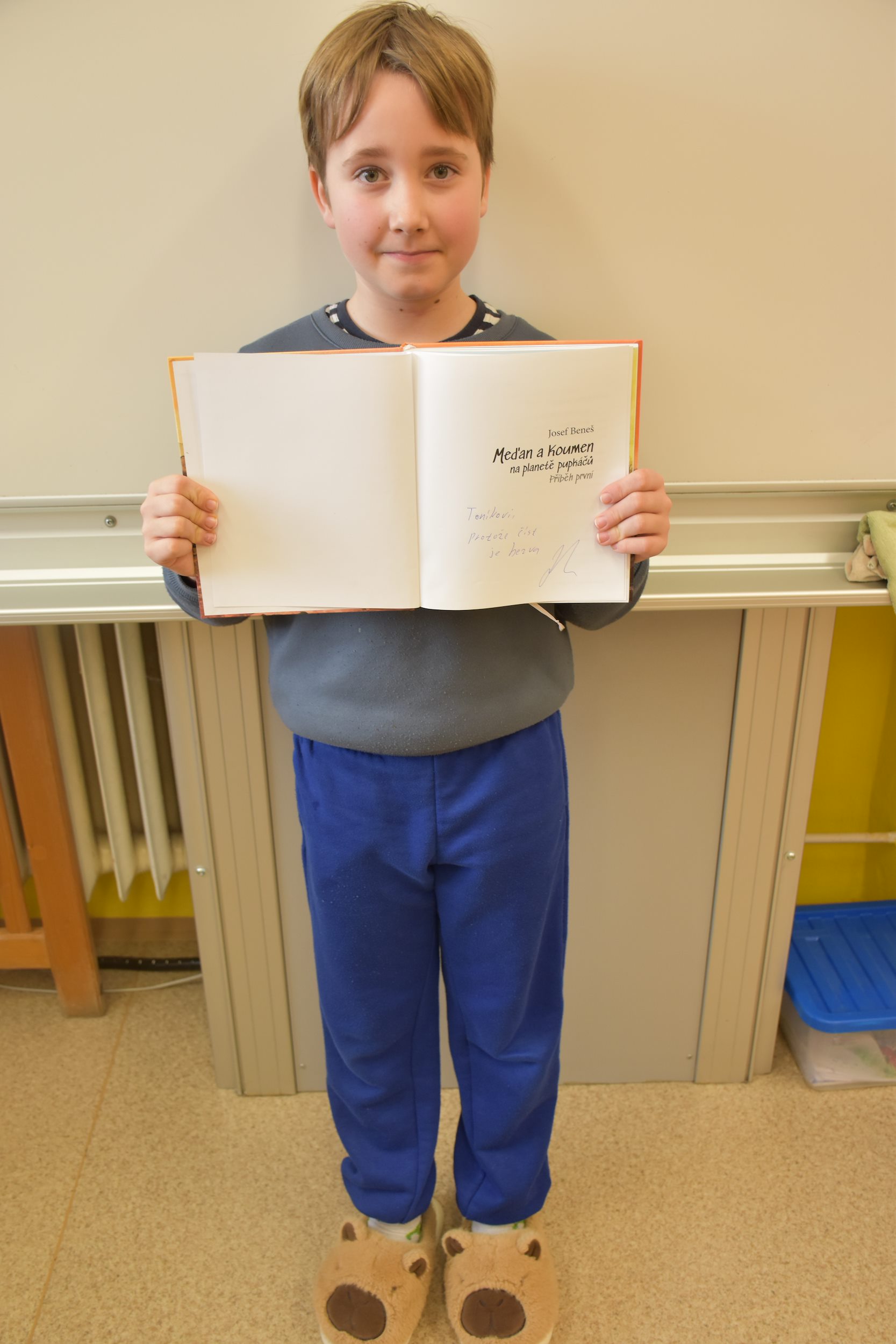 Dětem se setkání líbilo, některé si knížku zakoupily, dostaly do ní věnování a věnování pan Josef Beneš napsal i do výtisků, které jsme zakoupili do školní knihovny. Na závěr pan Beneš navrhl, že nám do školy pošle mailem rozpracovaný jeden z příběhů a děti ho budou moci dokončit a poslat mu své práce nazpátek, což byla moc pěkná tečka na rozloučenou.